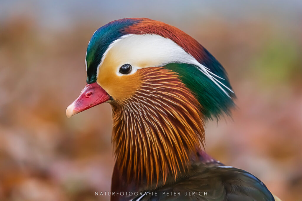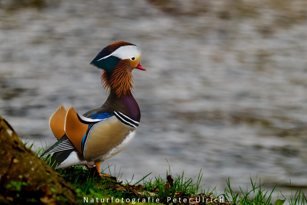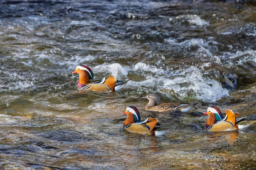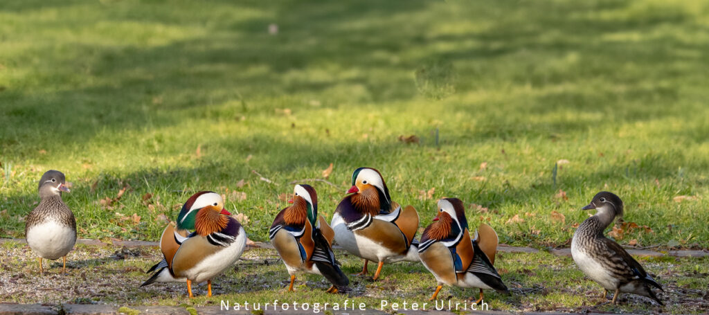 Mandarinenten, vier männliche Enten umrahmt von zwei weiblichen Enten, was wird hier wohl ausgebrütet?