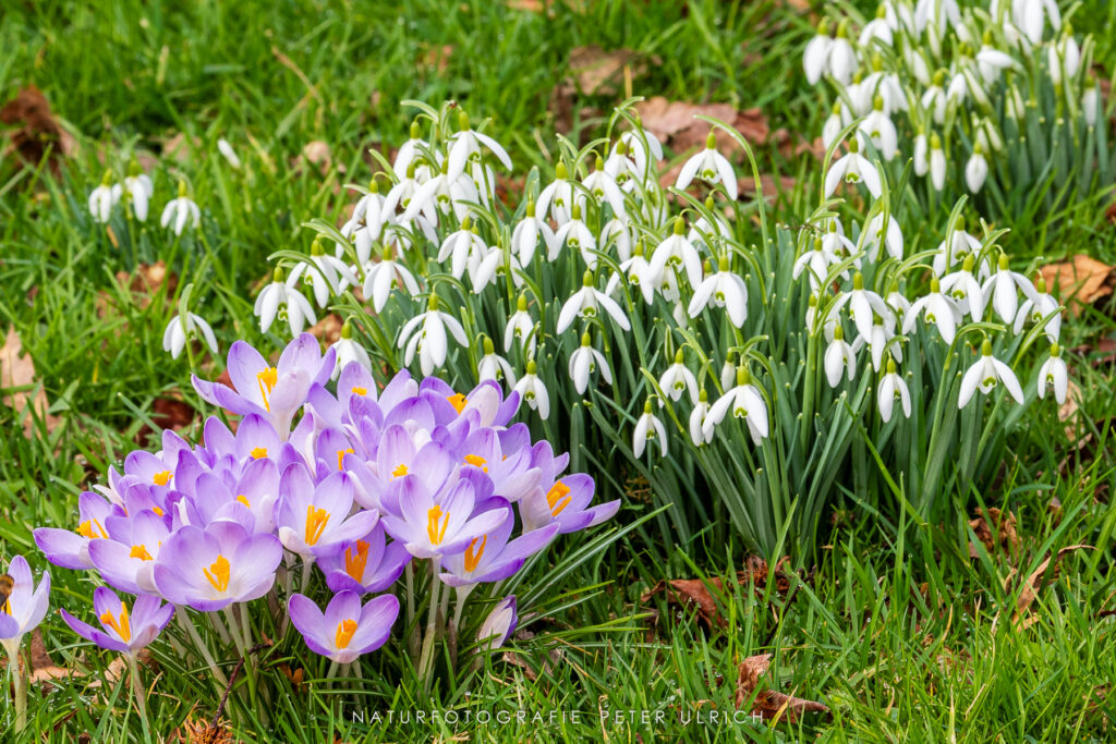 Neben dem Blütenmeer der Krokusse erblühen Schneeglöckchen und Winterlinge