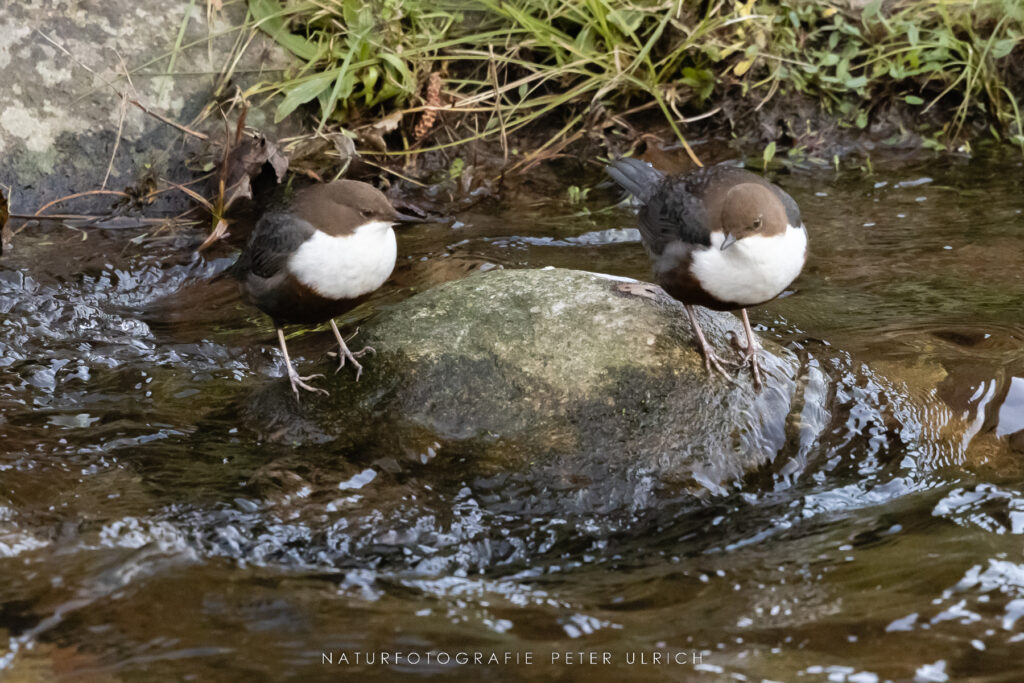 Ich bin die Wasseramsel. Ihr müsst schon genau hinschauen, um mich zu entdecken, da ich auch sehr gerne tauche, um Futter zu finden.