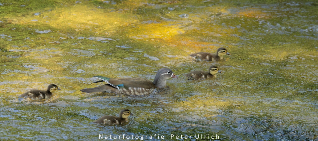 Mandarinenten-Weibchen mit vier Küken in der Oos