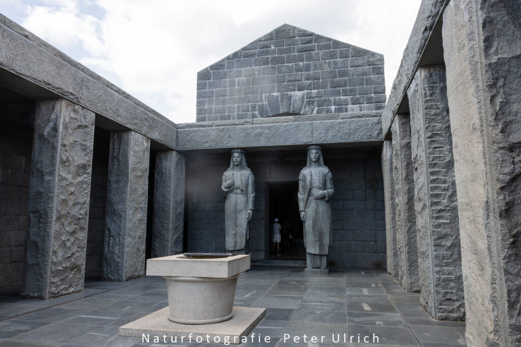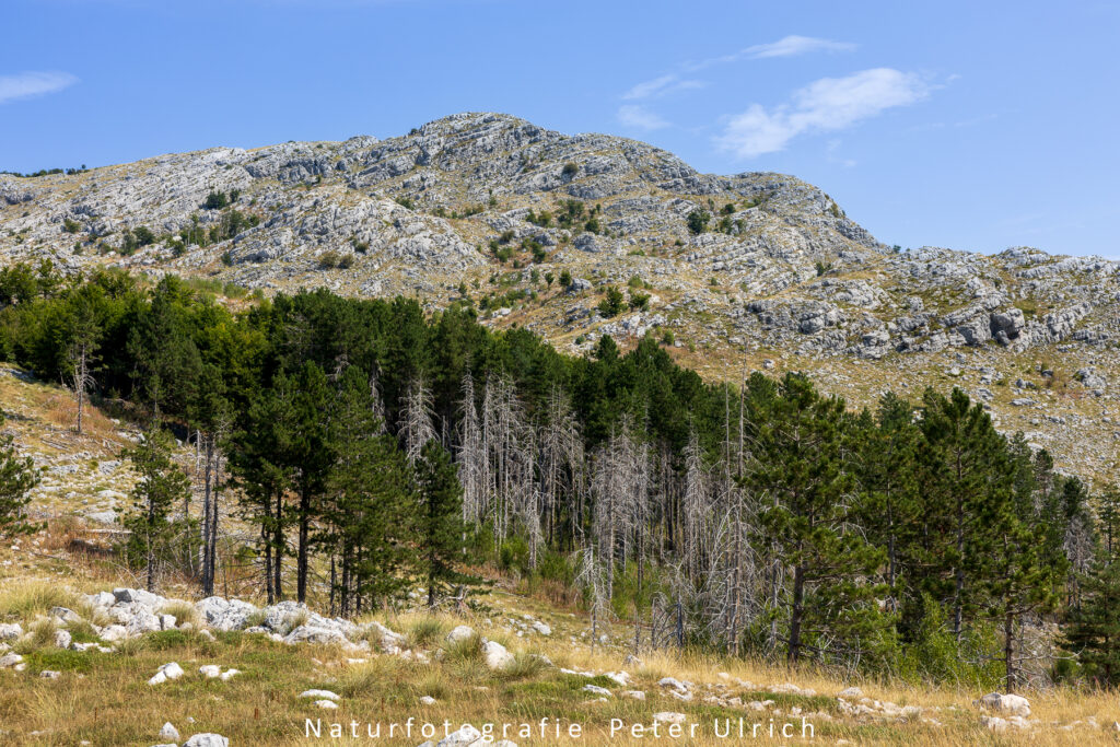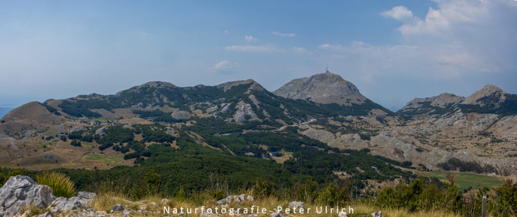 Wir verbinden den Besuch des Mausoleums mit einer ausgedehnten Wanderung durch das karstige Gebirge und kommen dabei nicht nur wegen der anschließenden 400 Treppenstufen bei sehr warmen Wetter arg ins Schwitzen. Auf dem Foto unten ist der Berg Jerzerski Vrh ganz rechts in der Ferne zusehen. Unser Ziel auf dem sich das Mausoleum befindet.